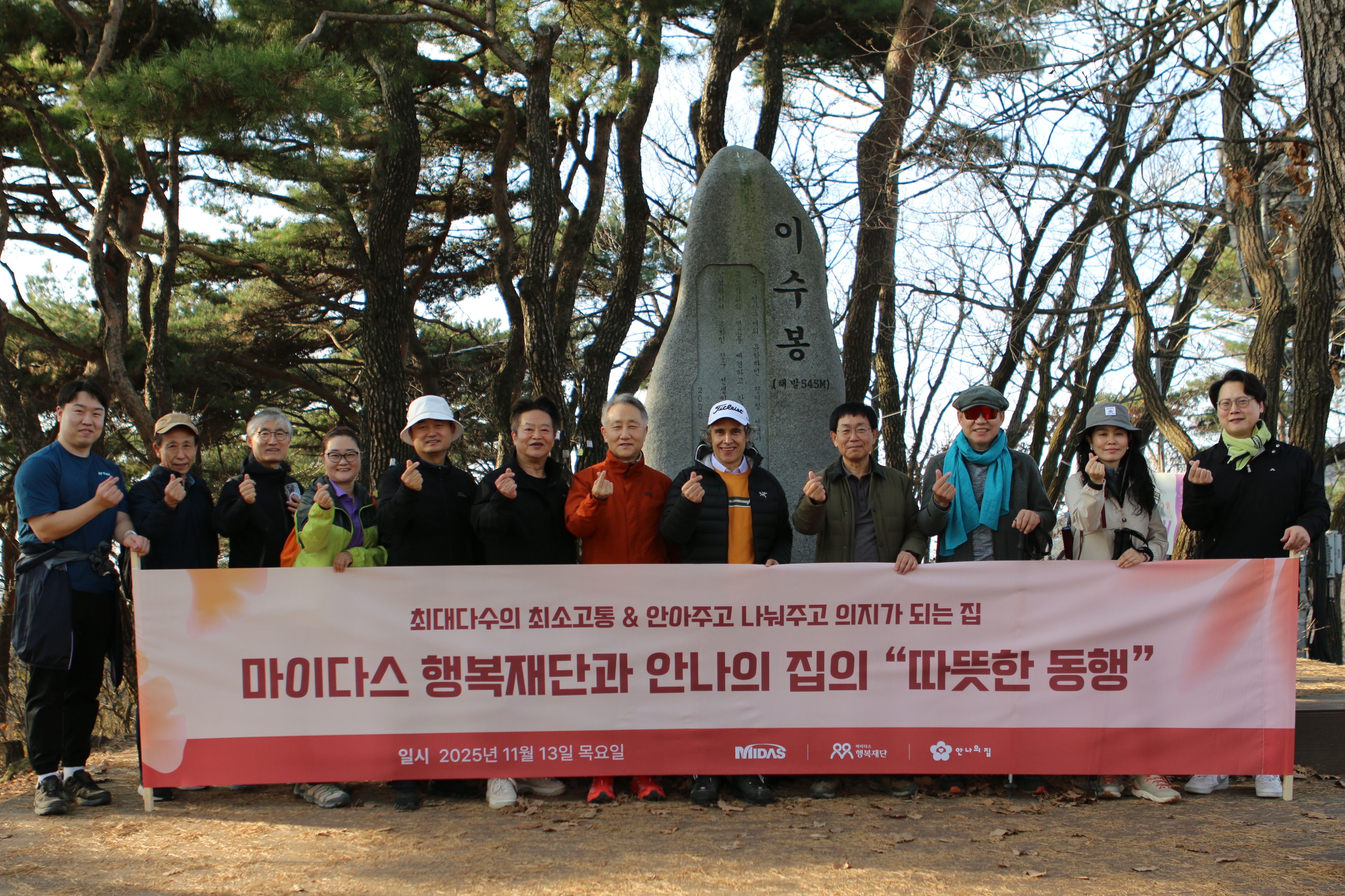 이날 이형우 마이다스 행복재단 이사장 및 이사회 임원들은 15년간 따뜻한 동행을 이어온 안나의 집 김하종 신부와 함께 청계산을 올랐다. 나눔 산행은 청계산 등반 완료 시 1인당 200만 원씩 기부금을 적립하는 방식으로 진행됐다.